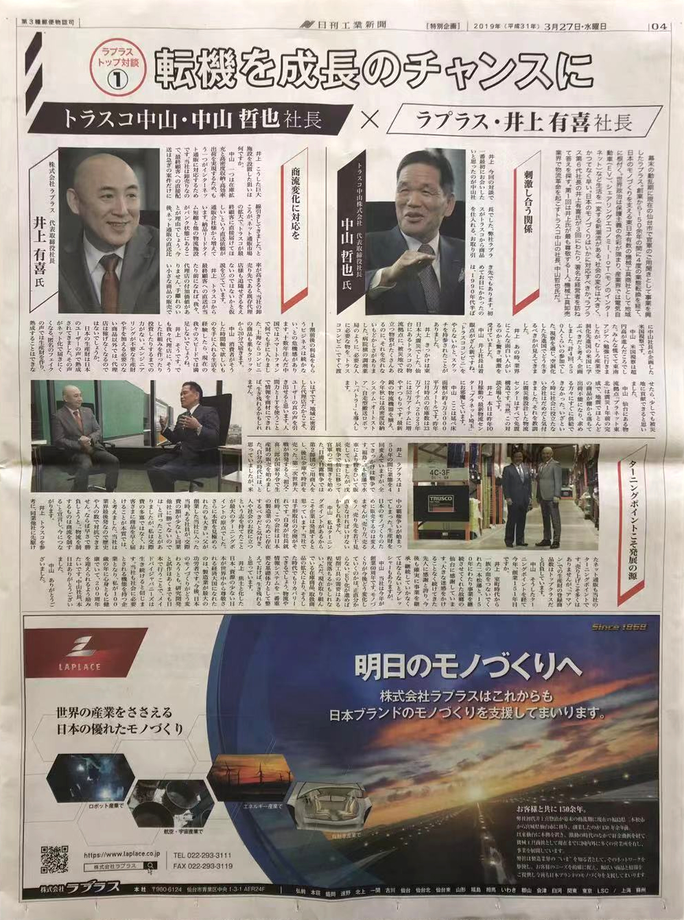 昨年、ラプラス創業150周年を記念し、かねてより交流がございました日刊工業新聞社様よりいただいた企画の第1回目として2/5(火)、トラスコ中山株式会社プラネット埼玉にて、井上社長と中山社長の対談の機会がございました。